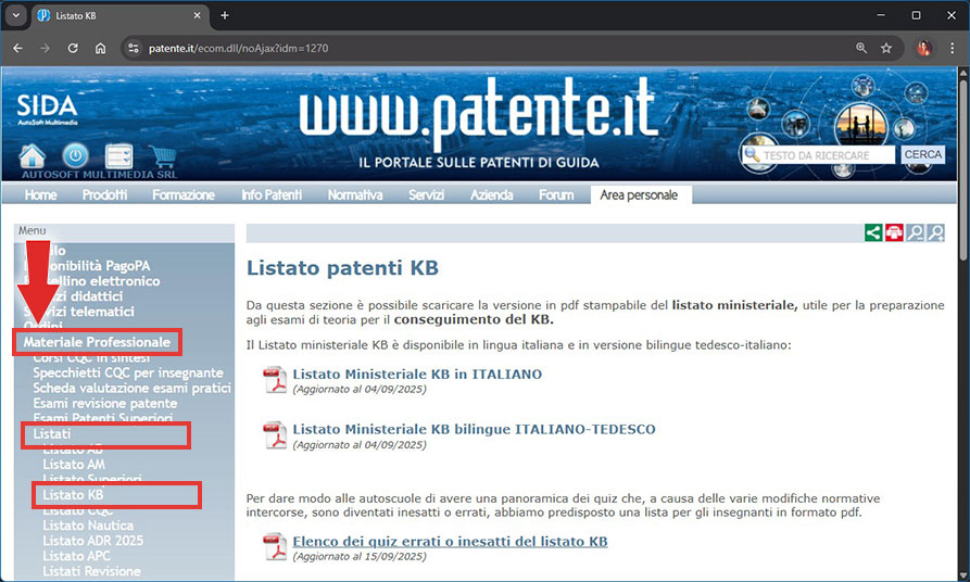 Nell'area personale del sito www.patente.it ("Materiale professionale" --> "Listati" --> "Listato KB") è pubblicata la versione aggiornata del listato ministeriale KB.