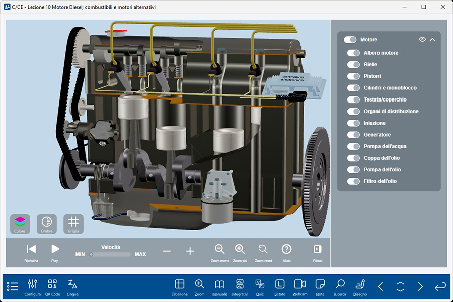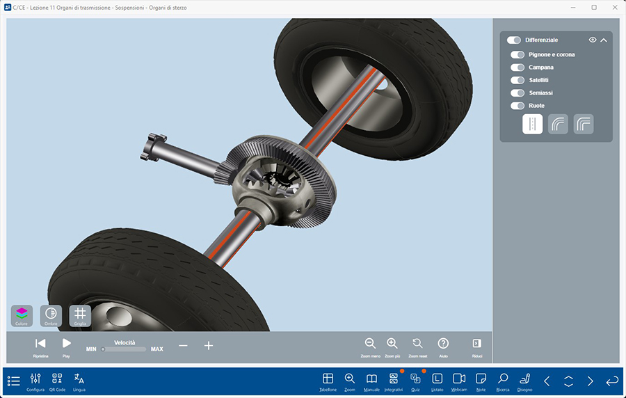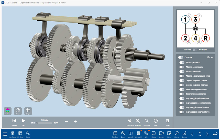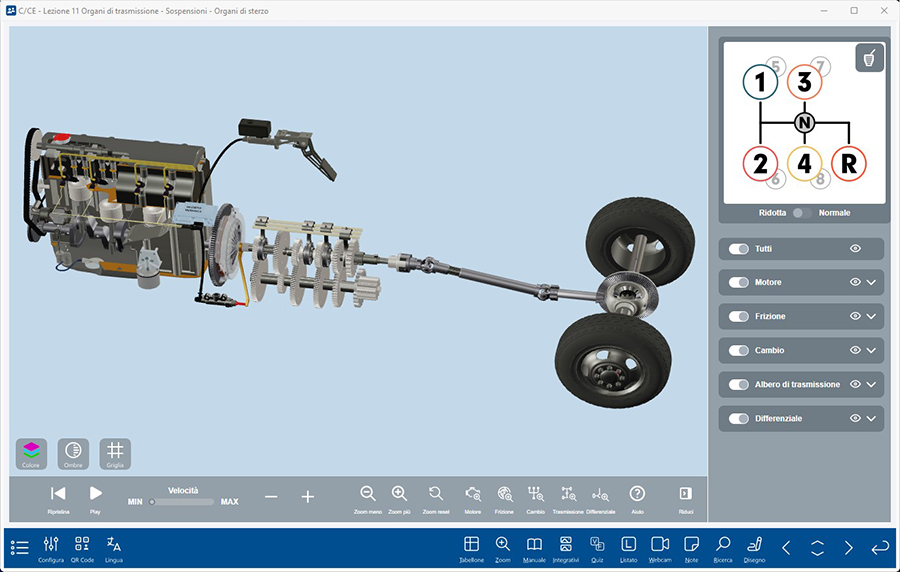 Si tratta di un vero e proprio simulatore 3D degli elementi della trasmissione e del motore che il docente può utilizzare in modo interattivo per spiegare il funzionamento di questi elementi del veicolo e per mostrare le concatenazioni tra i vari componenti.