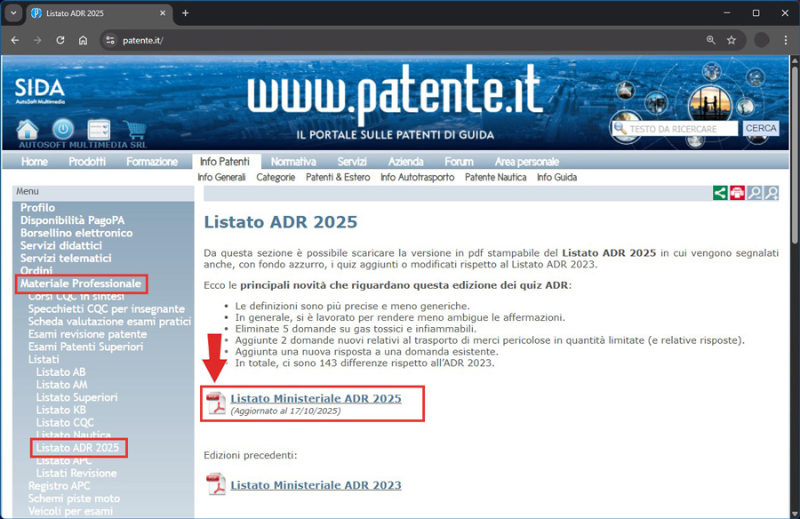 I clienti SIDA che vogliono confrontare nel dettaglio le variazioni del listato ADR 2025 rispetto al listato ADR 2023 possono farlo consultando il materiale apposito presente nell’area personale del sito www.patente.it (Materiale professionale --> Listati --> Listato ADR 2025).